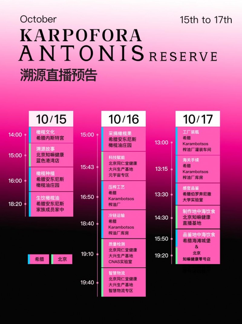 次日,直播间将聚焦橄榄油生产的核心环节,对全链路进行实景呈现。在希腊安东尼斯庄园,将实时直播橄榄果采摘实况,带您感受丰收盛景;随之在榨油厂,将展示橄榄果在传统工艺与现代技术的结合下,通过22道严谨而精细的工序化身为滴滴珍贵的橄榄油。此外,在同仁堂健康北京大兴工厂的元宇宙专区、智慧物流专区,以及CNAS实验室,也将分享橄榄油运输和鉴定相关知识,旨在让消费者对橄榄油的品质保障有更全面和深入的认识。