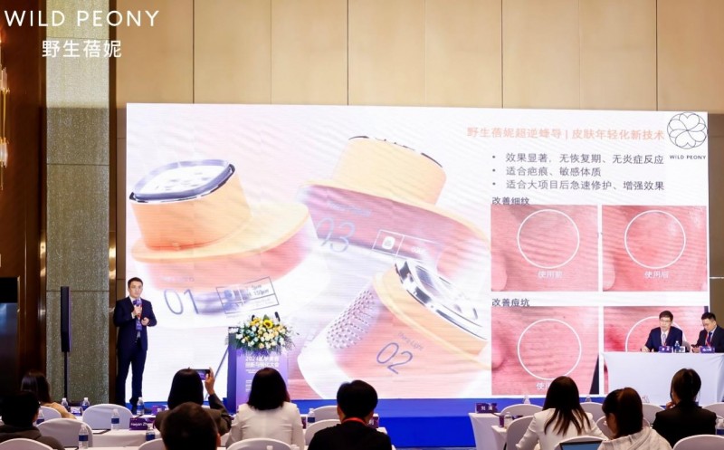 WILD PEONY野生蓓妮首席技术官杨帆博士, 在APAMA野生蓓妮冠名的技术与设备的创新与研发论坛专场,同样发表了精彩演讲。在演讲中,杨帆博士从技术角度详细讲解了「超逆蜂导」项目的原理。「超逆蜂导」其核心技术源自姚敏教授在哈佛大学医学院威尔曼光医学中心的创新性研究,通过点阵蜂导、能量光浴、负压软壳等野生蓓妮首创的专利技术,能够带来超越预期的皮肤年轻化效果。尤其在淡化细纹、紧致提升、修护痘坑等方面受到了医生教授、行业专家及求美者的一致好评。