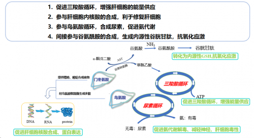门冬氨酸鸟氨酸具有多重肝保护作用机制,门冬氨酸可以促进肝细胞核酸的合成,并促进三羧酸循环,增强肝细胞能量供应,从而恢复肝细胞的结构和功能,起到退黄降酶、促进肝脏代谢的作用,间接参与谷氨酰胺的合成,生成谷胱甘肽,抵抗氧化损伤,鸟氨酸可促进尿素循环,解毒降氨,有效防治肝损伤/肝衰竭的并发症。